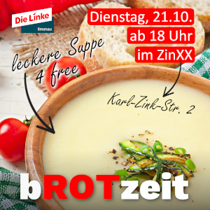 Wir laden am Dienstag, dem 21. Oktober wieder zu guten Gesprächen bei guten Essen ein. Ab 18 Uhr stehen die Türen des ZinXX (Karl-Zink-Str. 2) allen Interessierten offen. Diesmal wird eine vegane Käse-Lauch-Suppe serviert. Wir freuen uns auf dich.