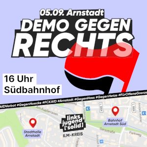 Die Linksjugend ['solid] lädt am Freitag zu einer Demo gegen Rechts nach Arnstadt ein. Unter dem Motto "Unsere Grenzen bleiben offen" fordern die Veranstalter eine Gesellschaft, in der Solidarität und Menschlichkeit an erster Stelle stehen. Wir können diese Forderung nur unterstützen und rufen deshalb zur Teilnahme an der Demo auf.