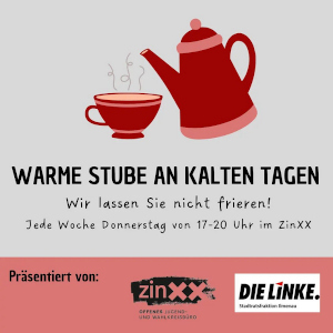 Jede Woche Donnerstag wird das ZinXX (Karl-Zink-Straße 2) von 17 bis 20 Uhr zur warmen Stube. Im November und Dezember warten wechselnde Unterstützungs- und Freizeitangebote sowie heiße Getränke auf euch. Kommt einfach vorbei!