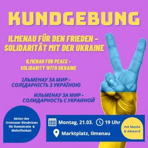 Wie bereits an den vergangenen Montagen findet auch am 21.3. wieder eine Kundgebung für Frieden und Solidarität mit der Ukraine statt. Treffpunkt ist 19 Uhr auf dem Marktplatz.