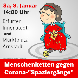Am Samstag planen die Erfurter "Omas gegen Rechts" zwischen 14.00 und 16.00 Uhr in der Erfurter Innenstadt eine Menschenkette für Demokratie und Rücksichtnahme in der Pandemie zu bilden. Es handelt sich um eine Standkundgebung, bei der die Teilnehmer*innen an der Menschenkette jeweils mit einem selbst mitgebrachten Band (bzw. Schal) von 2,00 Meter Länge miteinander verbunden sind, alle Teilnehmer*innen tragen Masken.