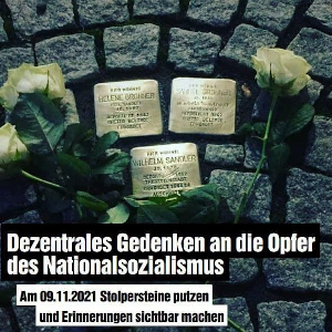 Auf Grund des Infektionsgeschehens laden die Wahlkreisbüros zum dezentralen Gedenken ein. Zum Beispiel, indem die Stolpersteine in Ilmenau geputzt werden. Die Utensilien, die zum Putzen von Stolpersteinen benötigt werden, können sich am 09.11.2021 von 10-14 Uhr im Grünen Wahlkreisbüro (Bahnhofstraße 20) und von 14-18 Uhr im Offenen Jugend- und Wahlkreisbüro ZinXX (Karl-Zink-Straße 2) ausgeliehen werden.