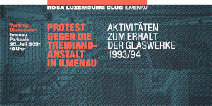 Wir weisen auf eine Veranstaltung des Rosa-Luxemburg Clubs Ilmenau hin. Dieser lädt für Dienstag, den 20. Juli um 18 Uhr zum Podiumsgespräch mit anschließender Diskussion zum Thema Glaswerke Ilmenau und Protest gegen die Treuhand ins Parkcafé in Ilmenau ein (Naumannstraße 22).
