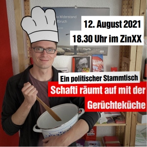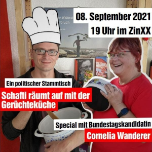 Diesen Mittwoch (08.09.2021) findet um 19.00 Uhr wieder Christian Schafts politischer Stammtisch im ZinXX (Karl-Zink-Str. 2 in Ilmenau) statt. Unter dem Motto „Schafti räumt auf mit der Gerüchteküche" lädt Christian ein Mal im Monat zum gemeinsamen Abendessen und politischen Gesprächen ein. Als Special Guest ist dieses Mal auch unsere Bundestagskandidatin Cornelia Wanderer dabei.